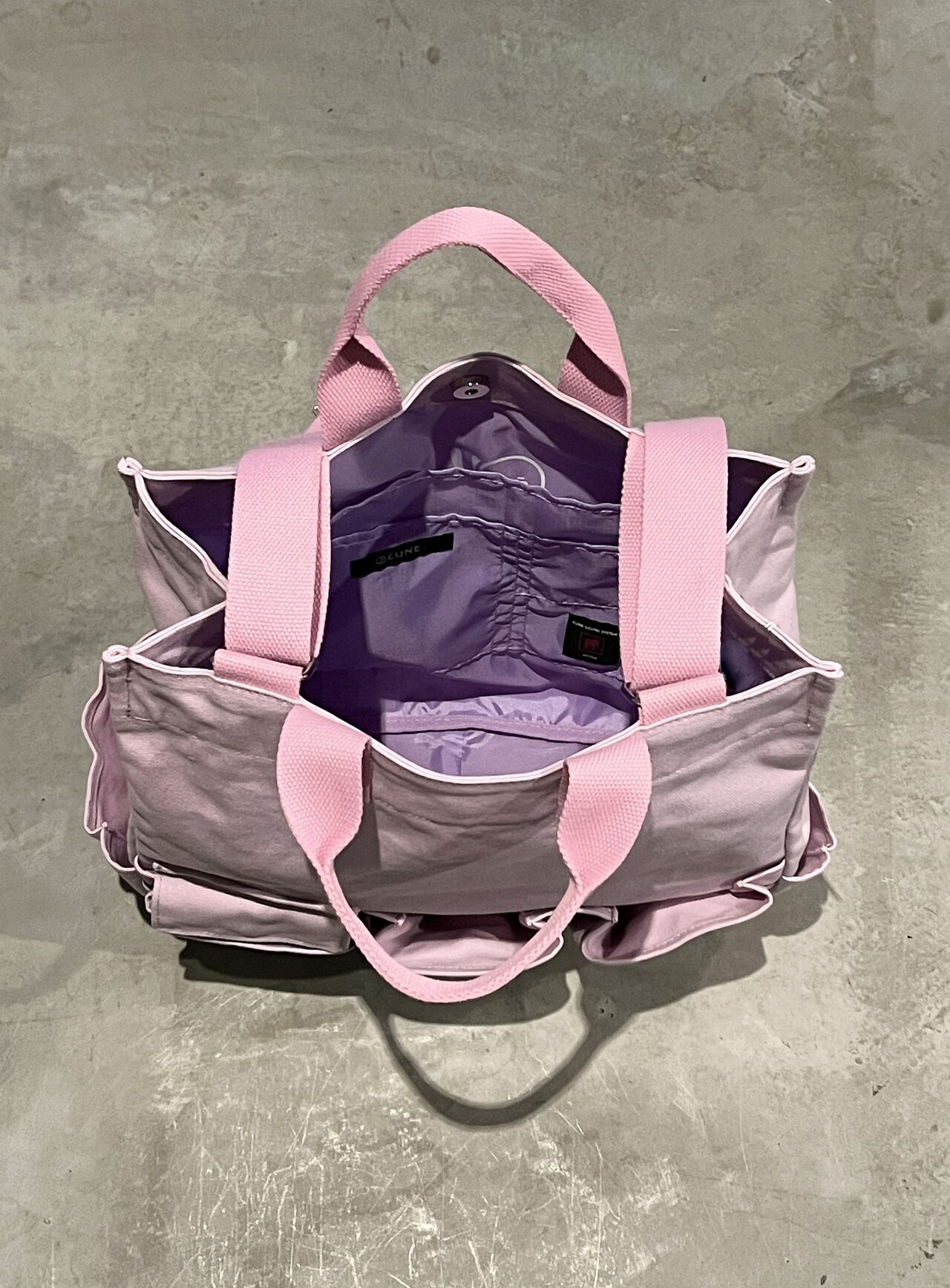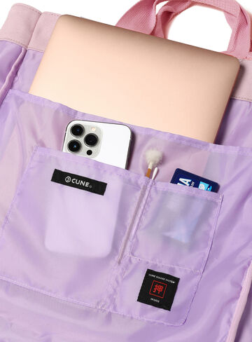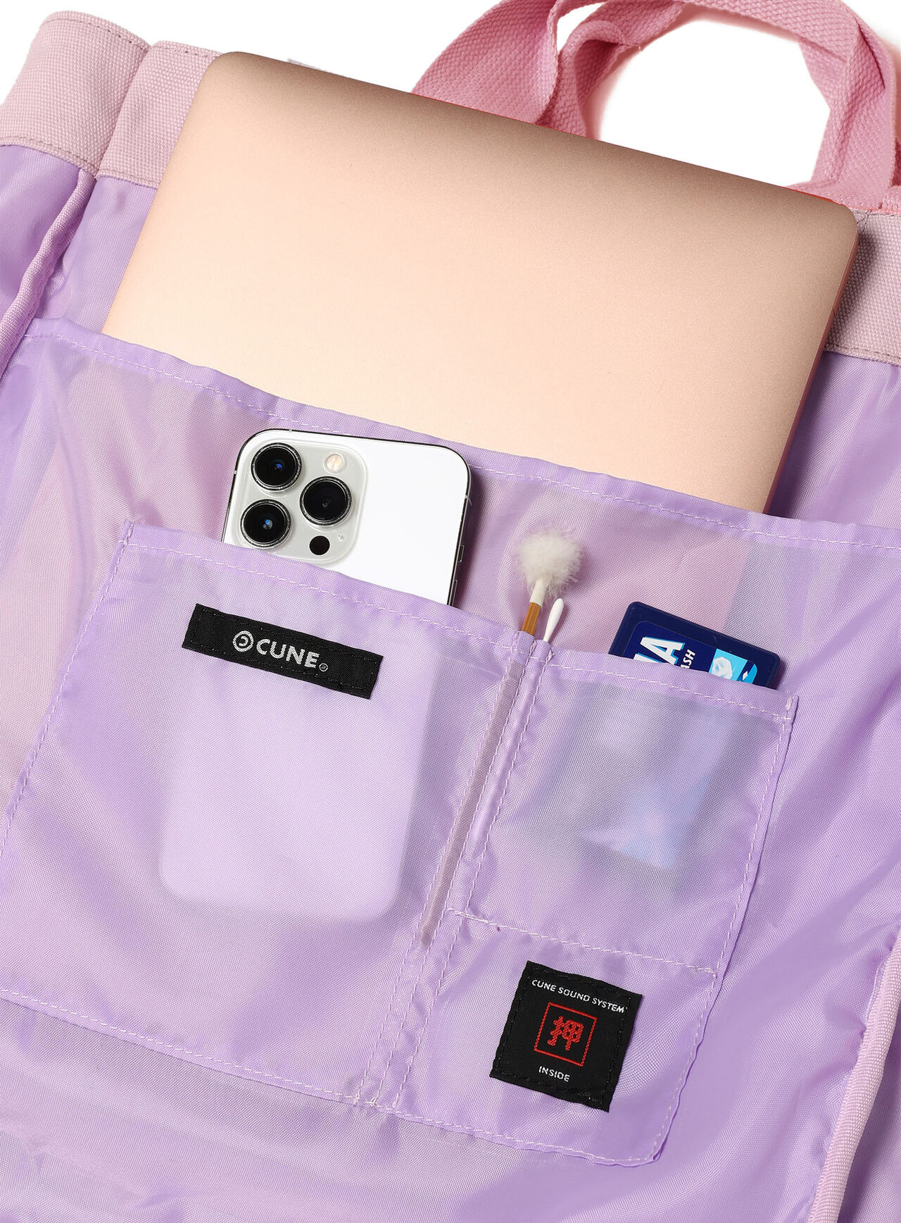 Canvas backpack with 10 external pockets. The main compartment can be opened and closed with a magnetic button, and the wide opening makes it easy to see and take out what is inside. The inside has a pocket with CSS (CUNE SOUND SYSTEM); CSS is sewn in and cannot be taken out.