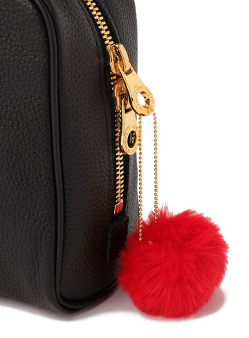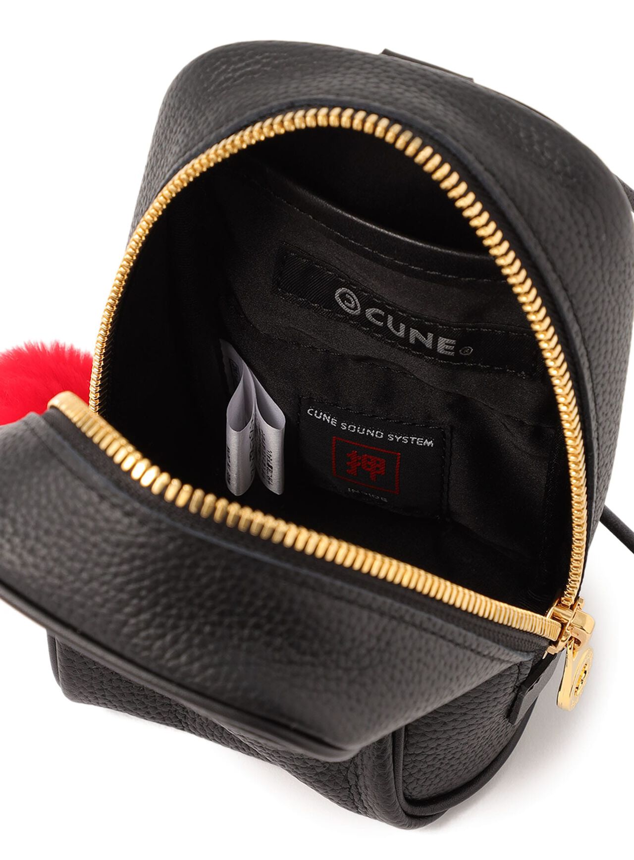 This pouch bag is made of natural shrink, scratch resistant leather. The slider has a very obtrusive faux fur bonbon, but it can be removed. CSS (CUNE SOUND SYSTEM) in the inside pocket; CSS is sewn in and cannot be taken out. The zip is made of YKK EXCELLA?
