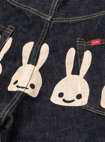 Fully redesigned new jeans - normally U5, with five rabbits printed on the hips. It has rabbit-engraved zip pulls, painted neova buttons and rivets, printed lining, and paper patches. The back edge is partially wrapped with tape. The fabric is 13.5 oz. Japanese denim. It incorporates the sewing method of old jeans, and although it looks ordinary, it is surprisingly well made. *Color fading and color migration may occur due to friction, wetness, and washing due to the characteristics of indigo fabric. Color transfer to prints may also occur. We cannot accept returns or exchanges due to the characteristics of the fabric, so please purchase with your understanding.