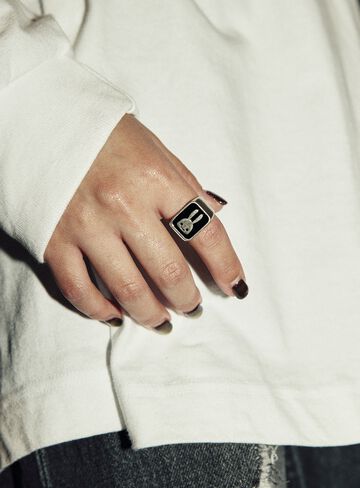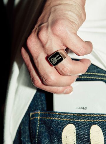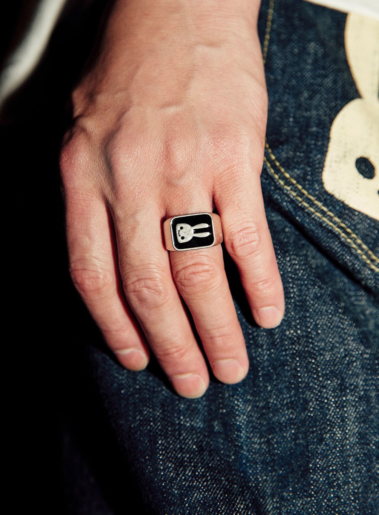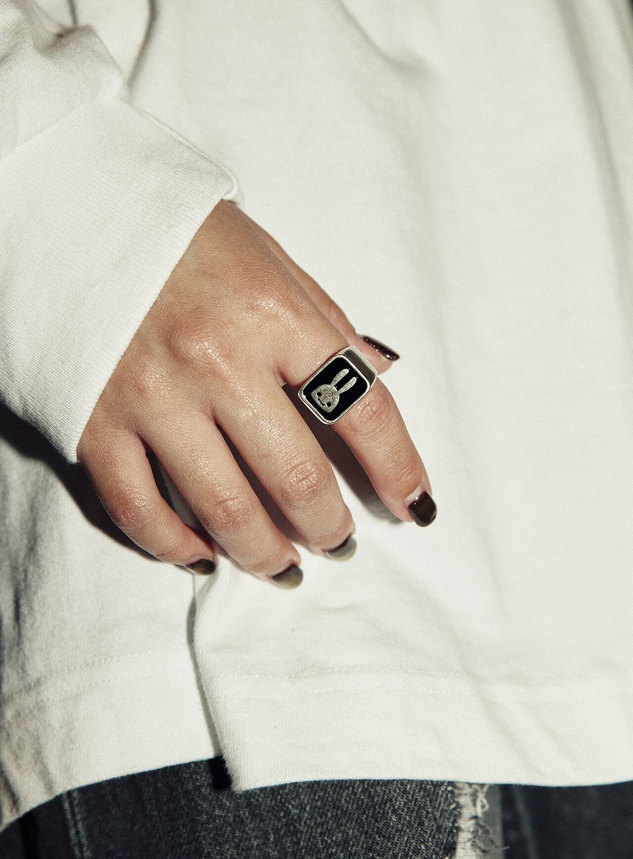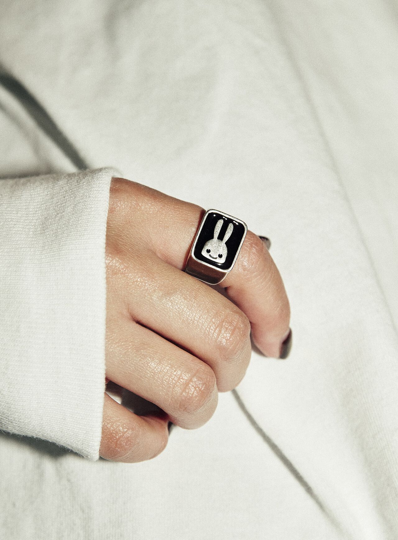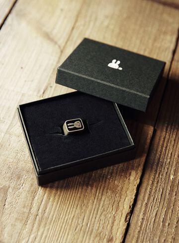 Rabbit ring with rabbit facing sideways when worn. Comes with a paper box with rabbit logo.