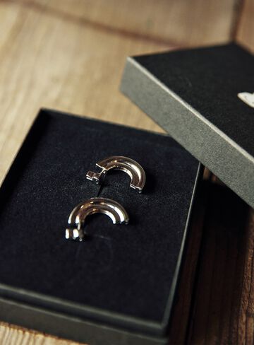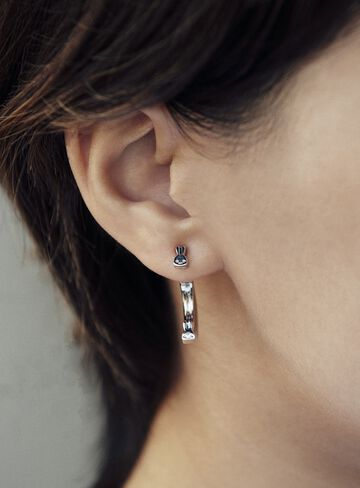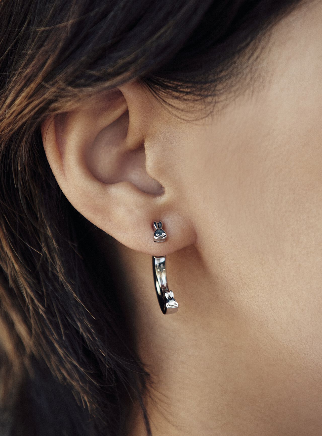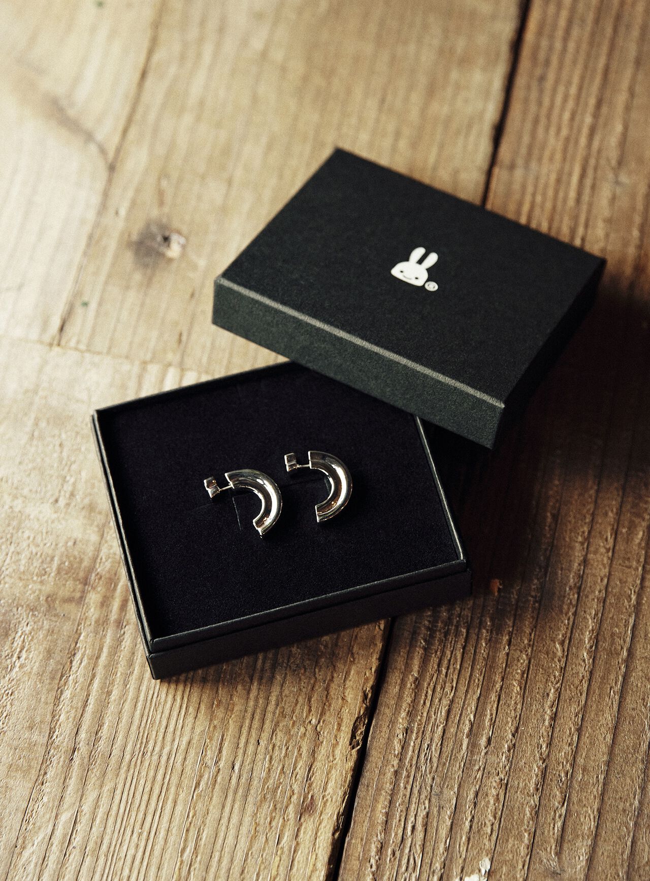 2 pairs of earrings that look like rabbits stretching out, with a paper box with rabbit logo.