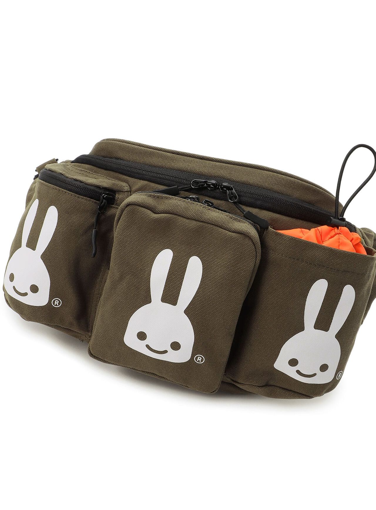 Dog walking body bag. There are two zippered compartments on the front side and one compartment with a drawcord for poop or a plastic bottle. The top inside of the main compartment has "Wan Wan" printed on the top surface. Inside, there is one zippered compartment that can be opened both ways with a D-can that can be removed with a buckle. There is a silicone patch on the top surface, just right for cords and such. there is an inside pocket with CSS (CUNE SOUND SYSTEM), but it is sewn in and cannot be taken out.