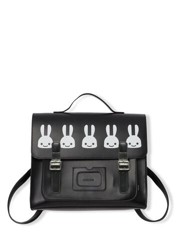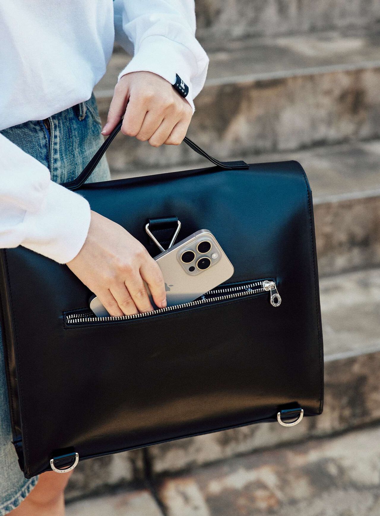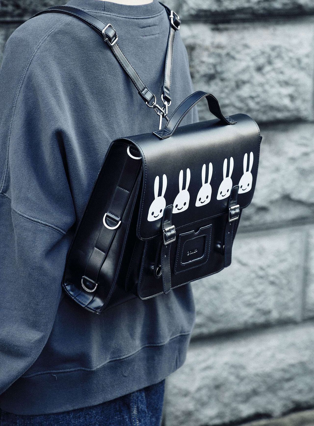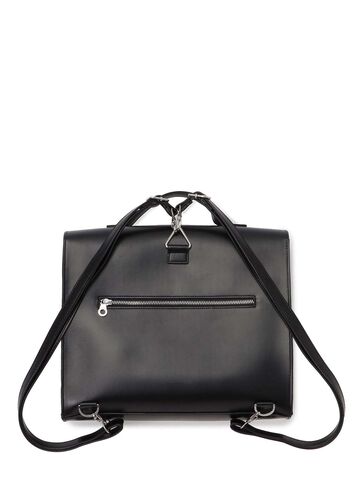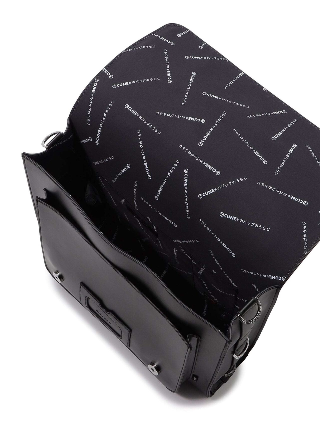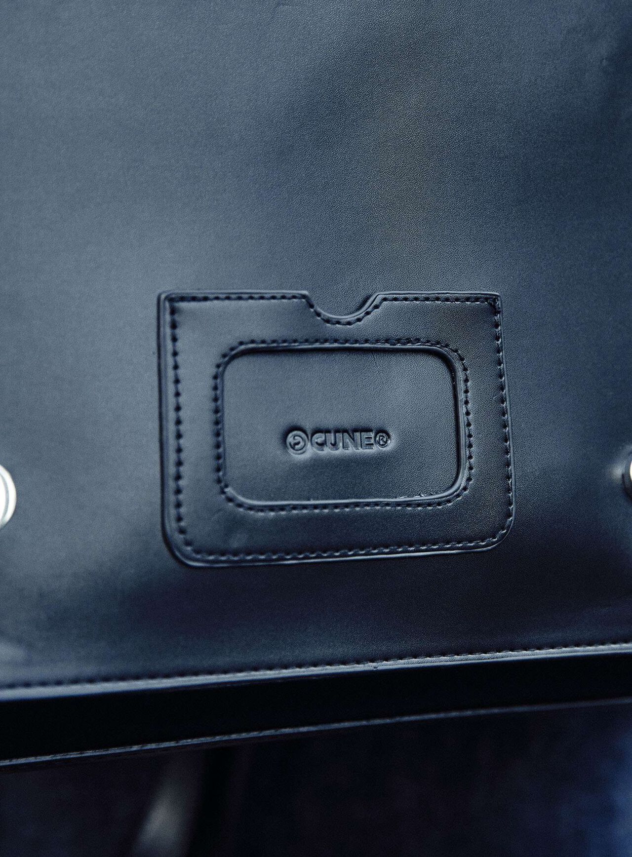 Square flap bag in synthetic leather. The belt section can be opened and closed with a magnetic button. A compartment with a logo stamped on the center of the front surface can be used for periodicals, cards, etc. The main compartment has an inside pocket with a zip and CSS (CUNE SOUND SYSTEM), which is sewn in and cannot be removed. The shoulder is detachable so it can be used in three ways: backpack, handheld, and shoulder.