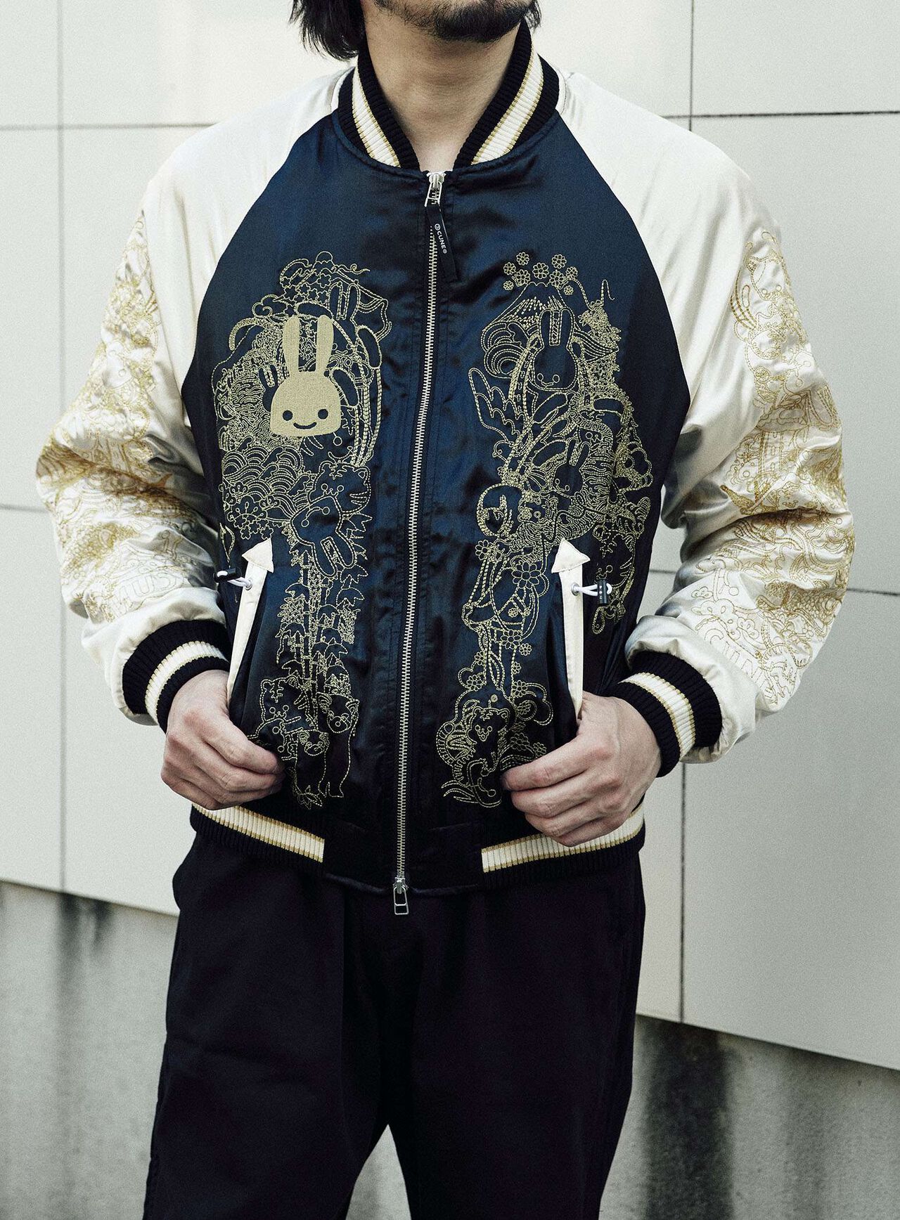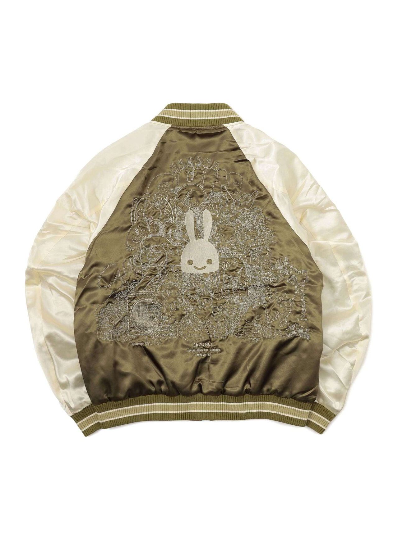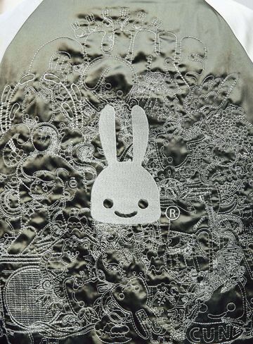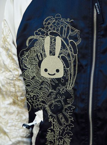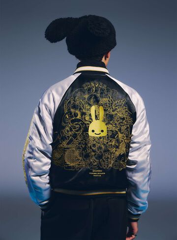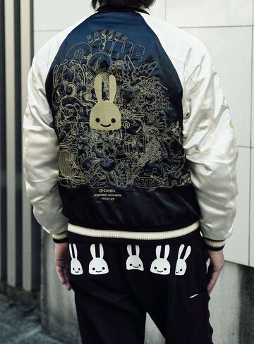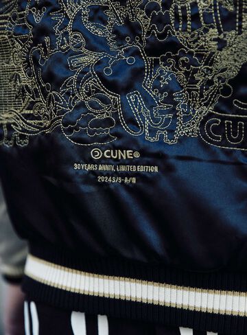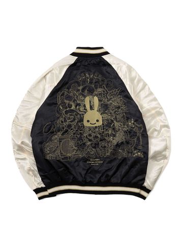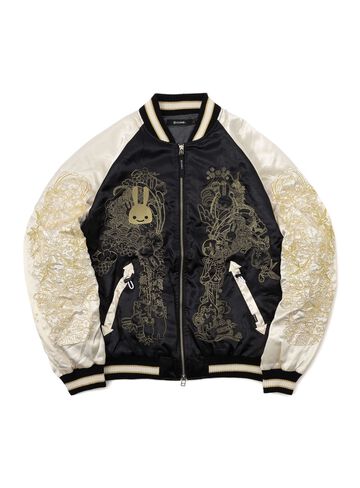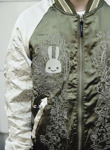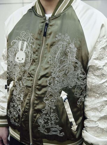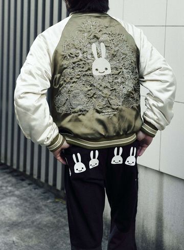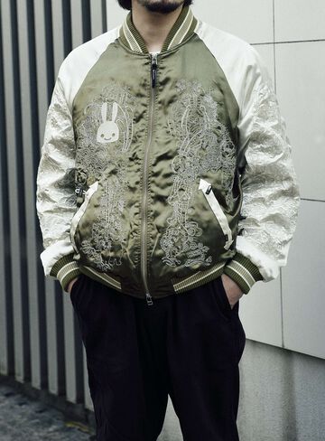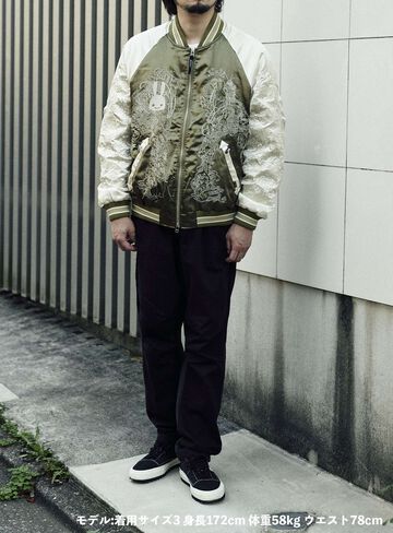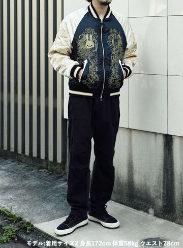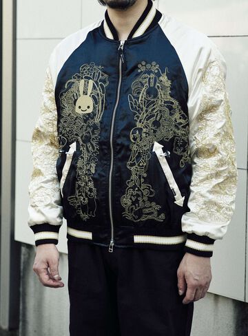 Souvenir jacket for 30th anniversary products. A large collection of past Sukajan graphics. The padding is made of Thinsulate. There is a drawcord through the waist pocket, which can be used to squeeze the pocket mouth, but it is of no particular significance. There are inside pockets on both chests, one with Velcro tape and one with dotted buttons. The front opening is double-zipped, so it can be opened and closed from either the top or bottom. Please handle with care, as the material is delicate and may tear if subjected to excessive stress.