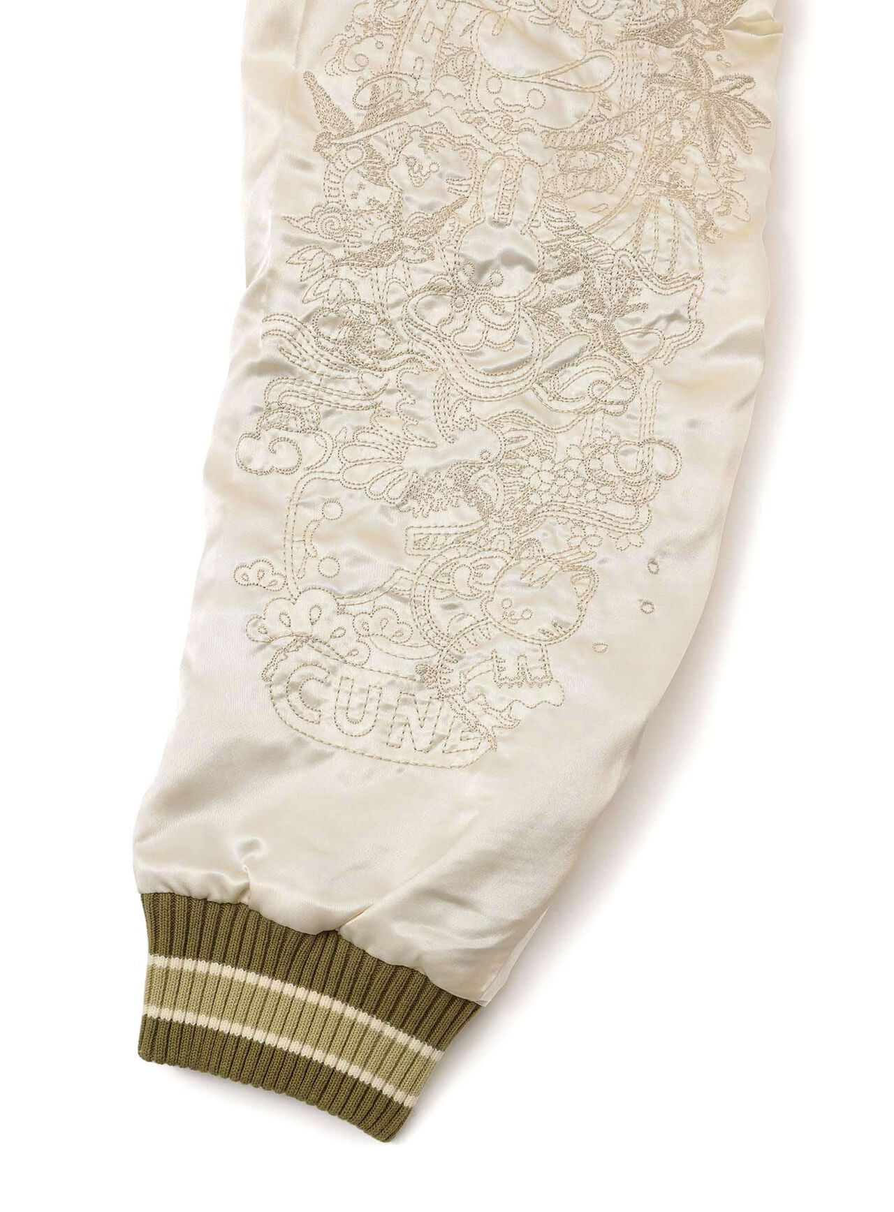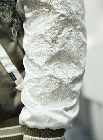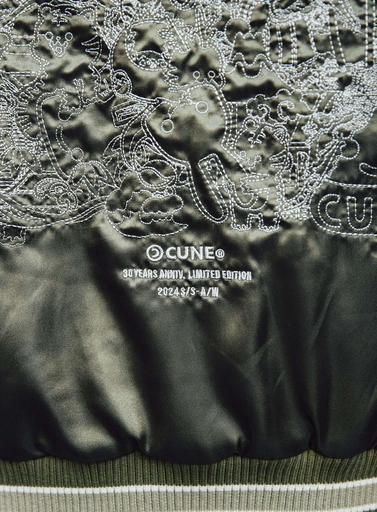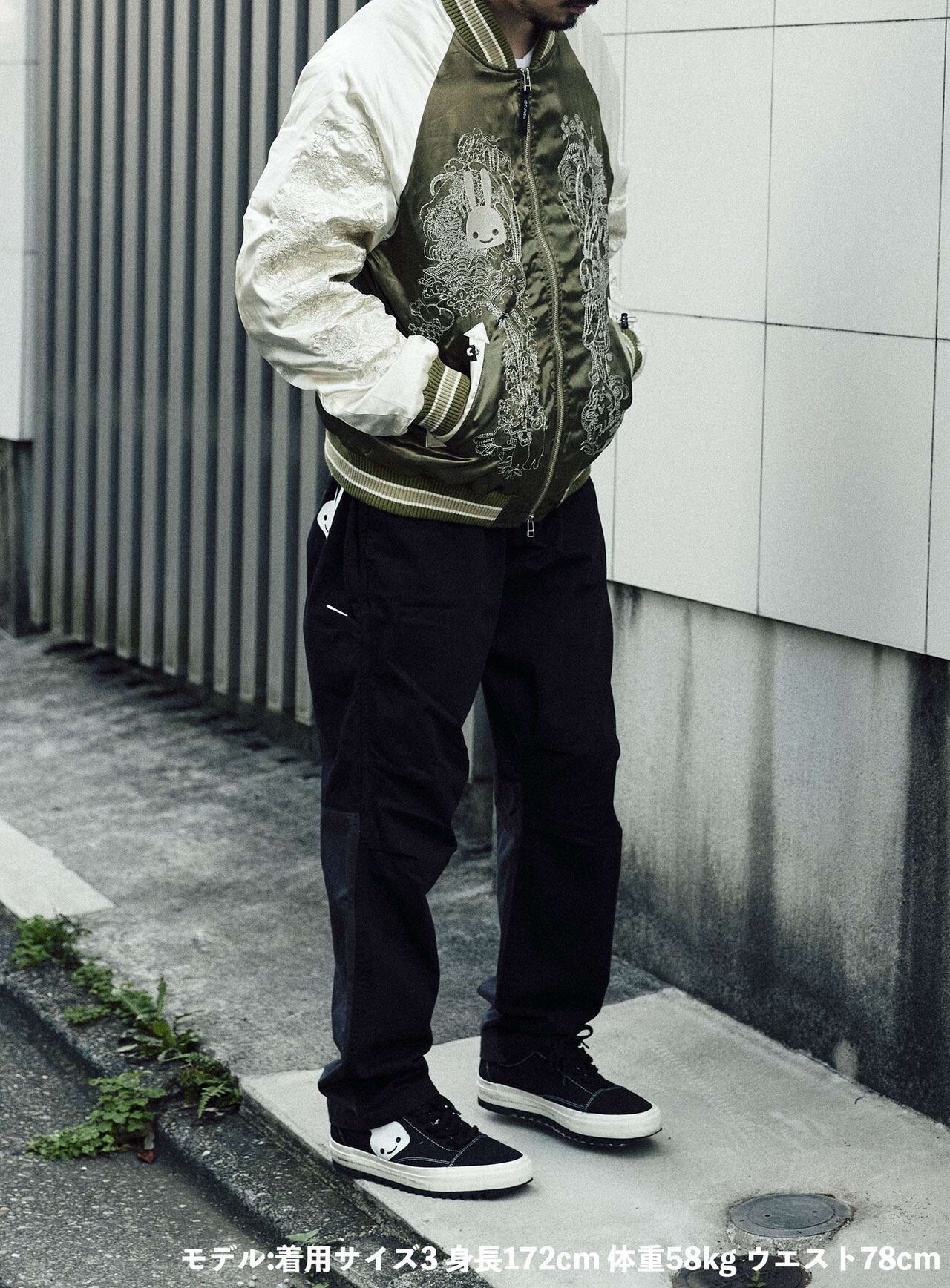 Souvenir jacket for 30th anniversary products. A large collection of past Sukajan graphics. The padding is made of Thinsulate. There is a drawcord through the waist pocket, which can be used to squeeze the pocket mouth, but it is of no particular significance. There are inside pockets on both chests, one with Velcro tape and one with dotted buttons. The front opening is double-zipped, so it can be opened and closed from either the top or bottom. Please handle with care, as the material is delicate and may tear if subjected to excessive stress.