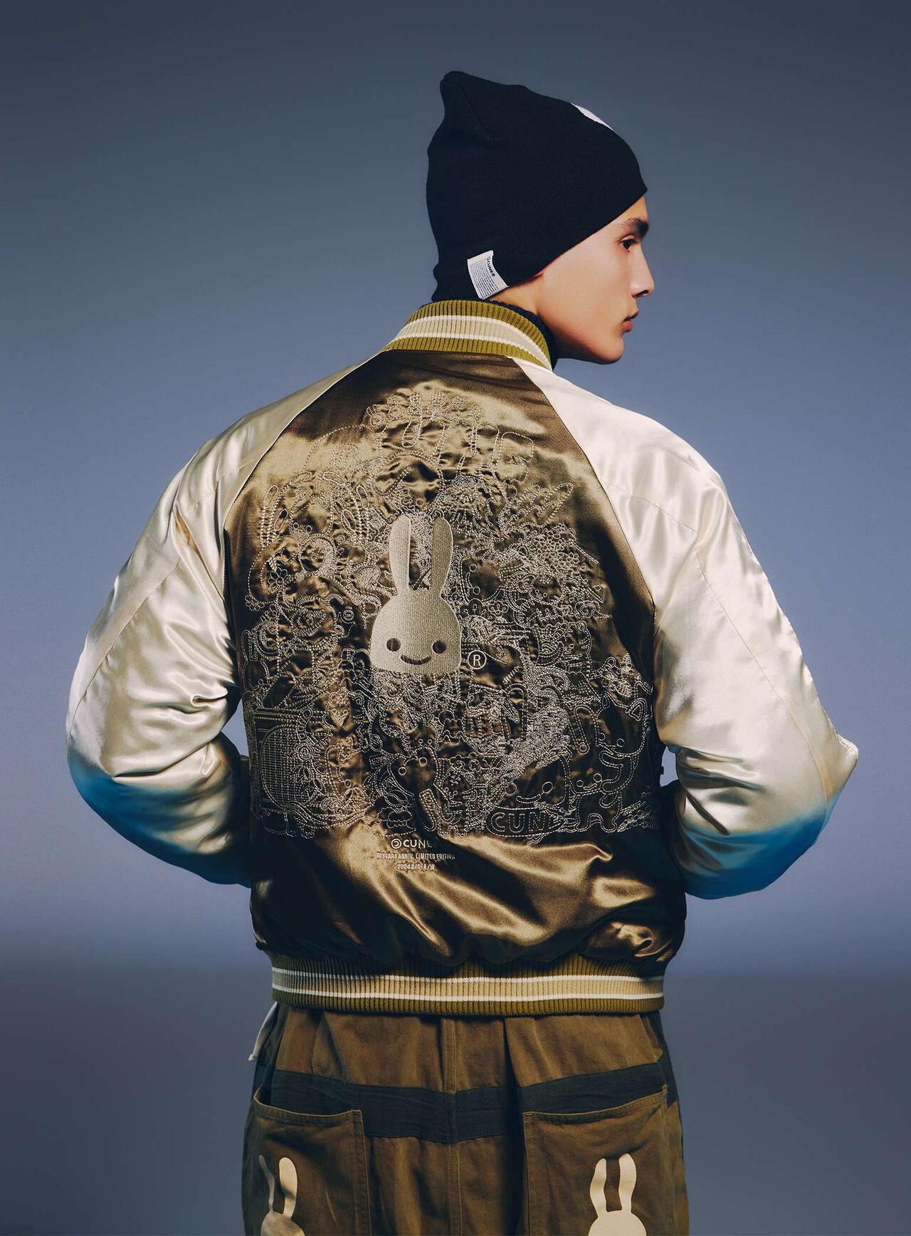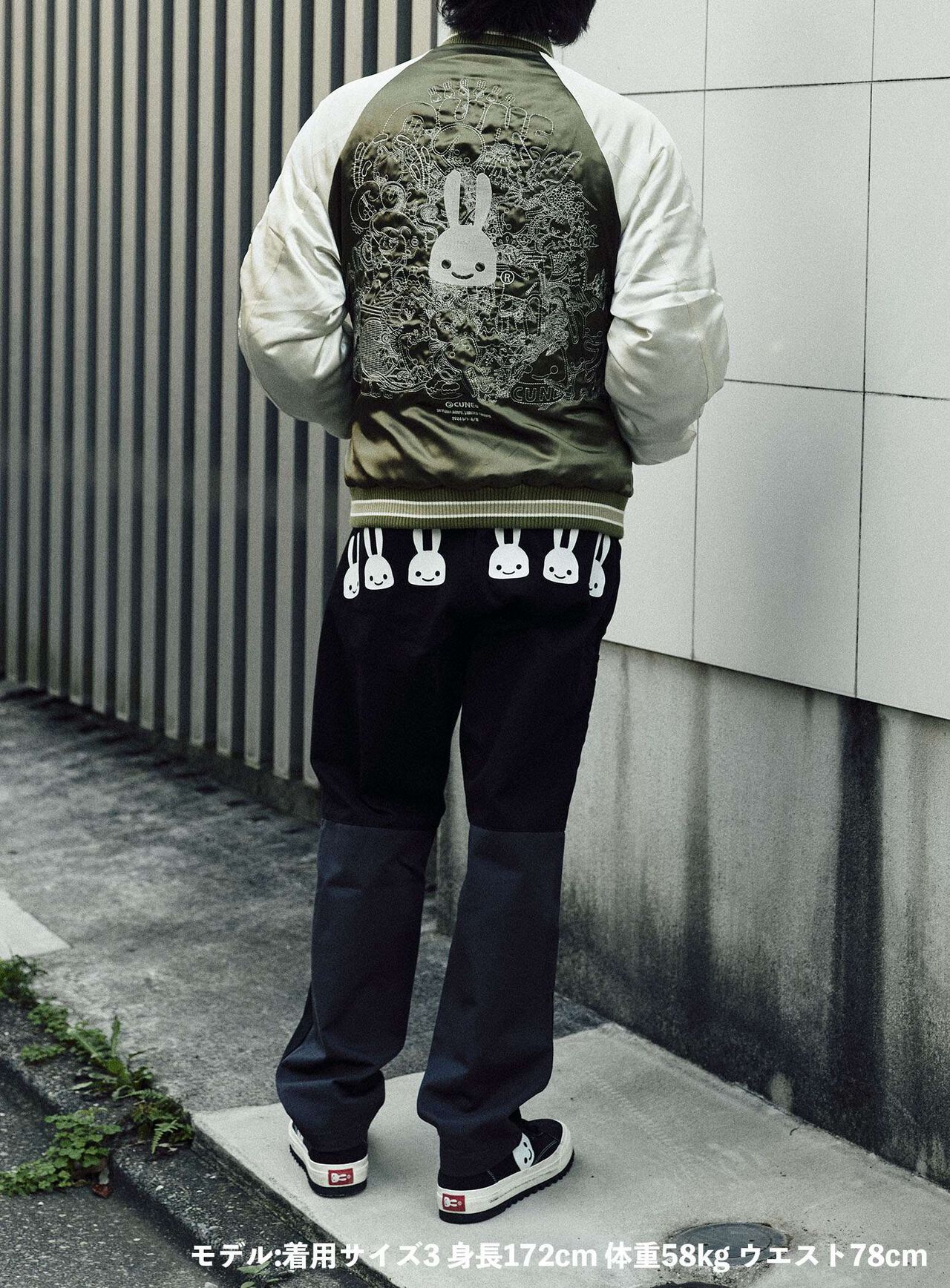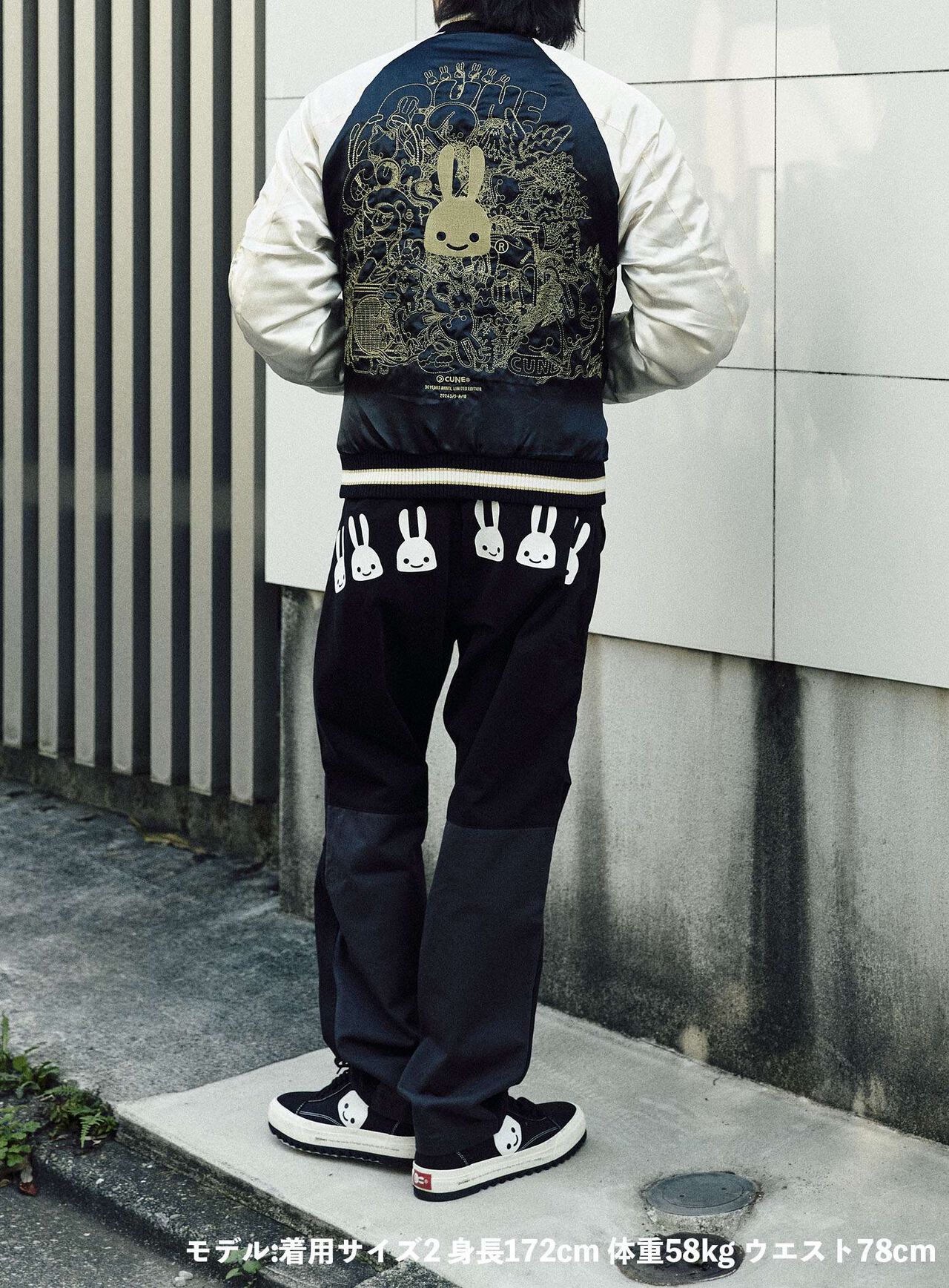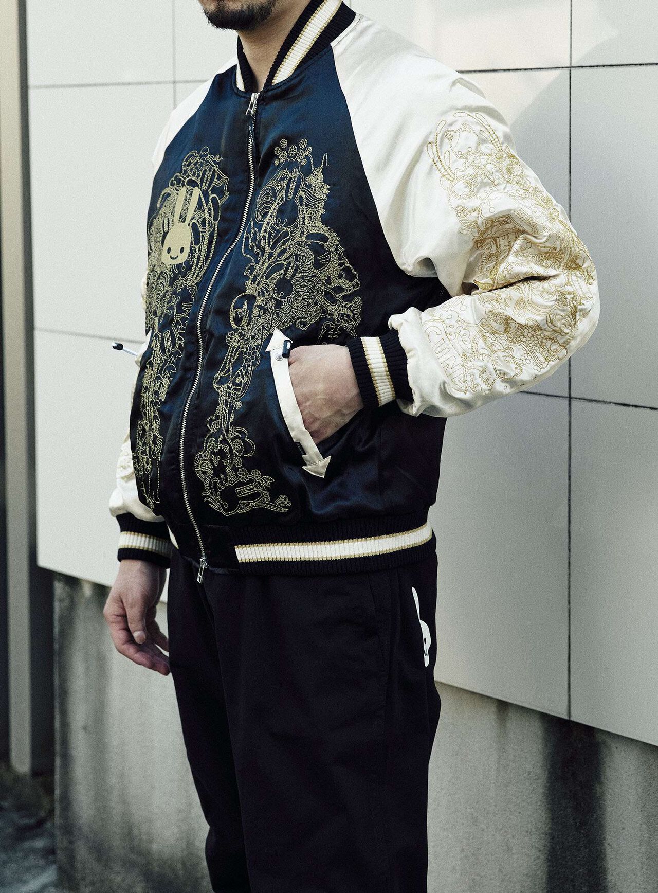 Souvenir jacket for 30th anniversary products. A large collection of past Sukajan graphics. The padding is made of Thinsulate. There is a drawcord through the waist pocket, which can be used to squeeze the pocket mouth, but it is of no particular significance. There are inside pockets on both chests, one with Velcro tape and one with dotted buttons. The front opening is double-zipped, so it can be opened and closed from either the top or bottom. Please handle with care, as the material is delicate and may tear if subjected to excessive stress.
