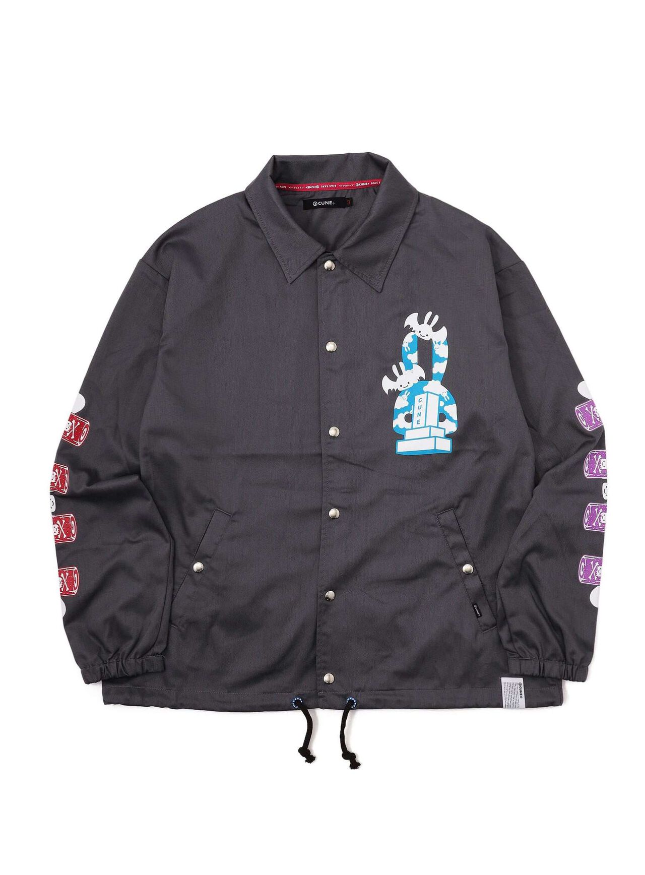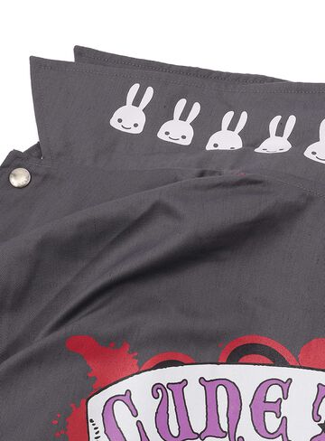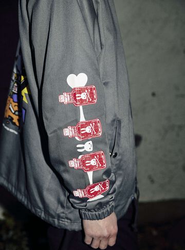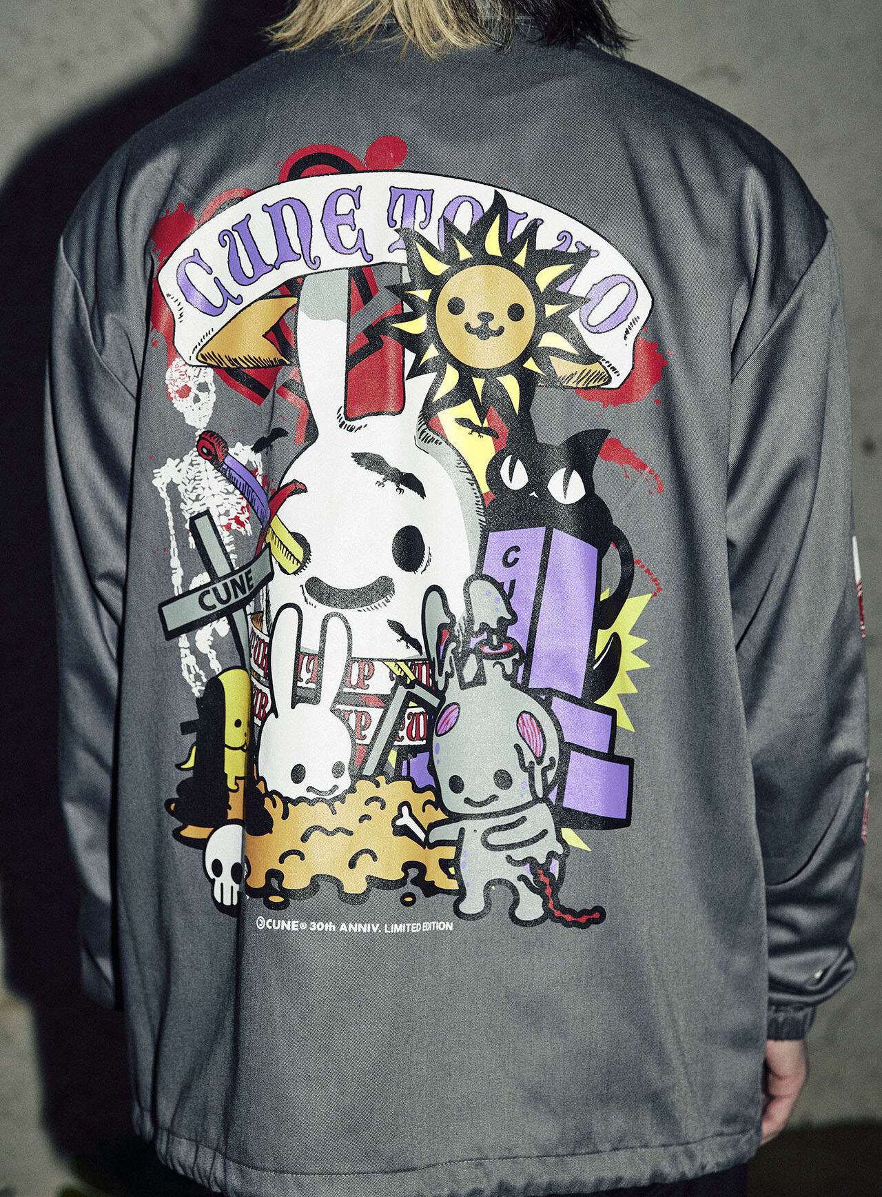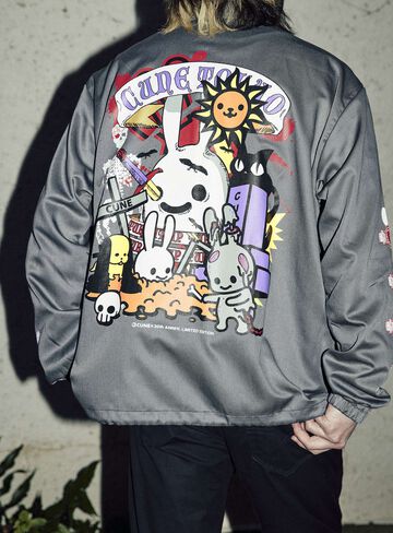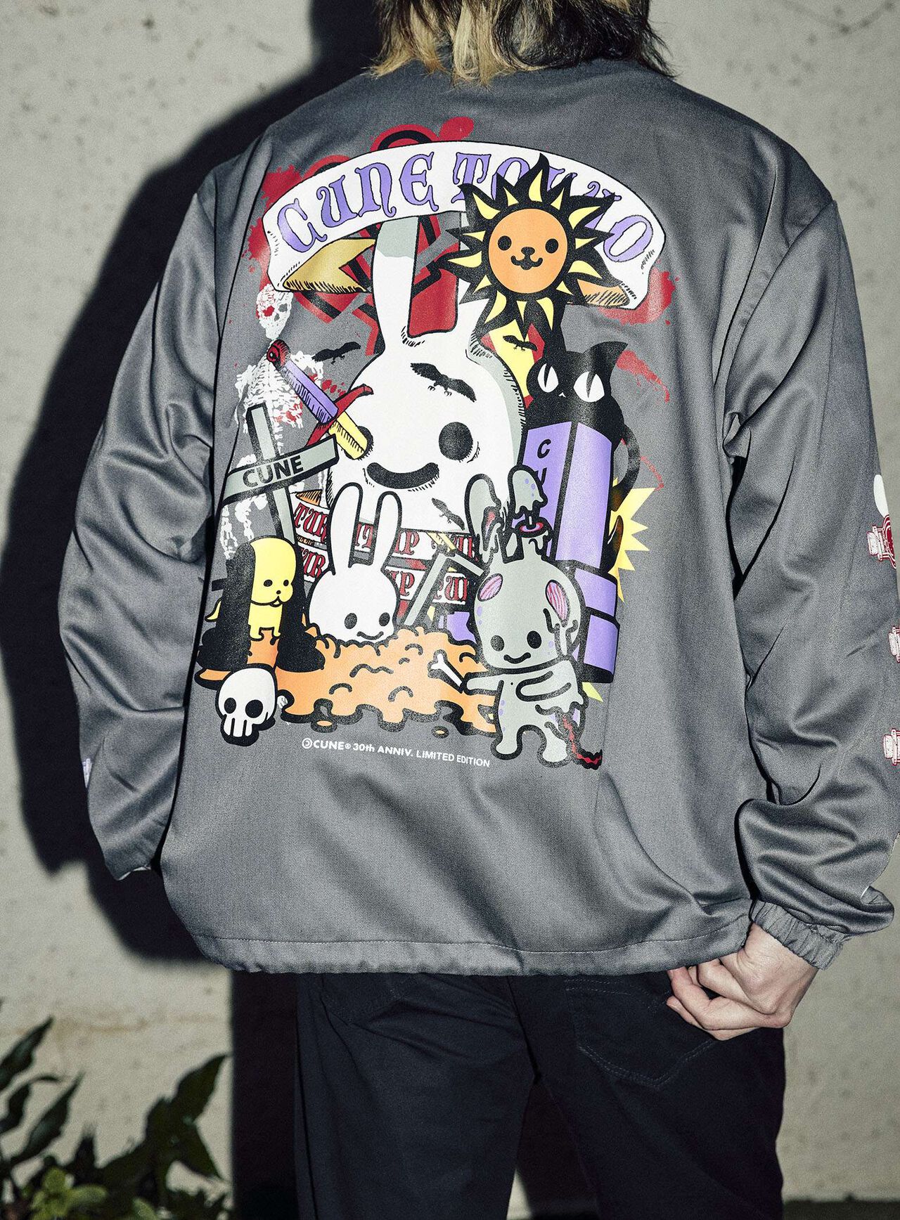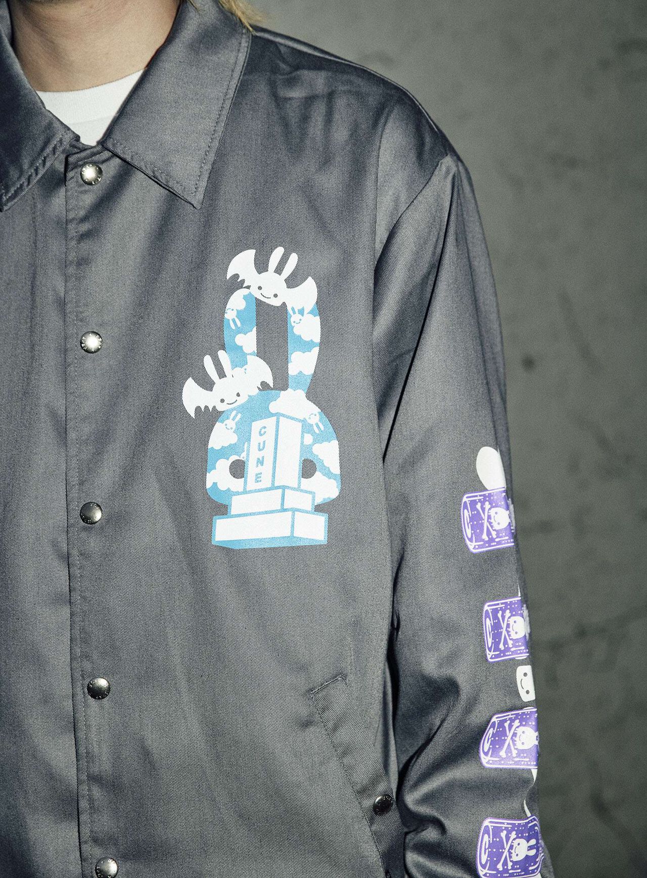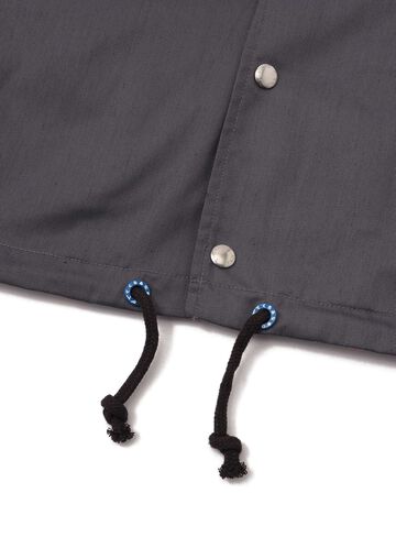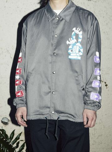T/C twill coach jacket. One-ply tailoring with original snap buttons at front opening and hip pockets. The sleeves are elasticized and the hem can be cinched with a string. A rabbit is printed on the back of the collar, which is not visible from the front. The elbows are darted to give the sleeves a slightly three-dimensional appearance.