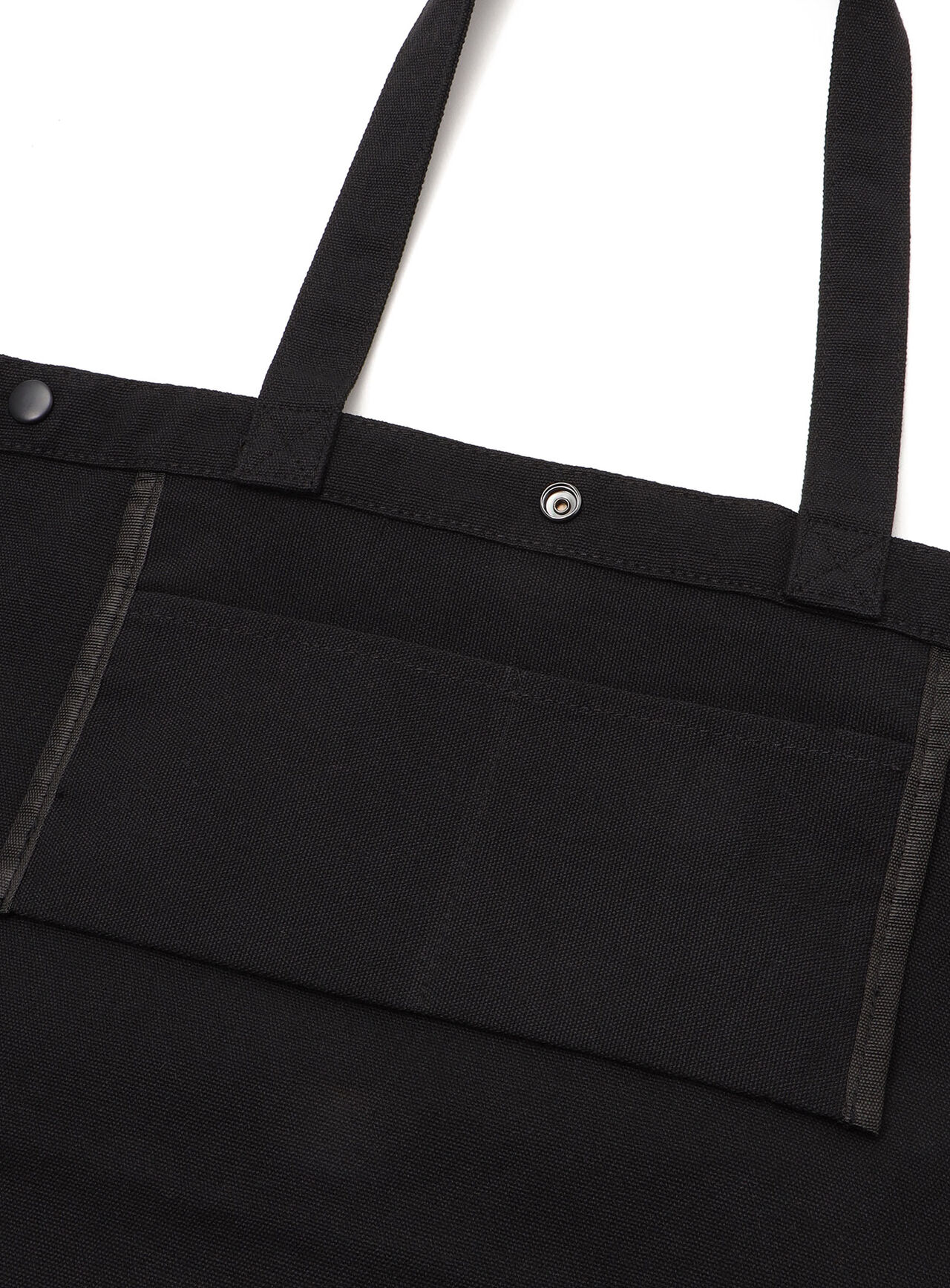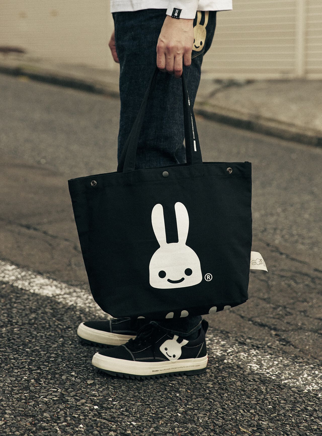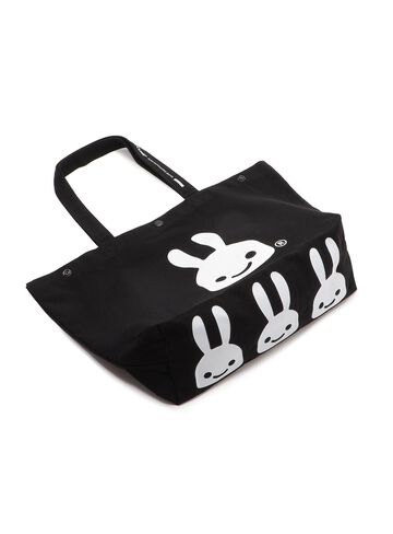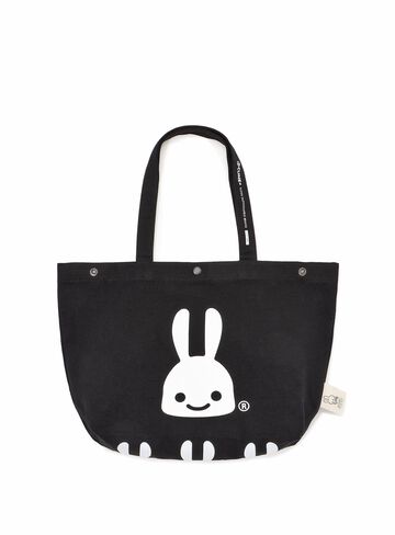 Canvas tote bag. Snap buttons at the opening. There are also snap buttons on the side to change the shape. A rabbit is commonly printed on the bottom. It has an inside pocket and a print on the bottom that looks like the bag is talking to you.