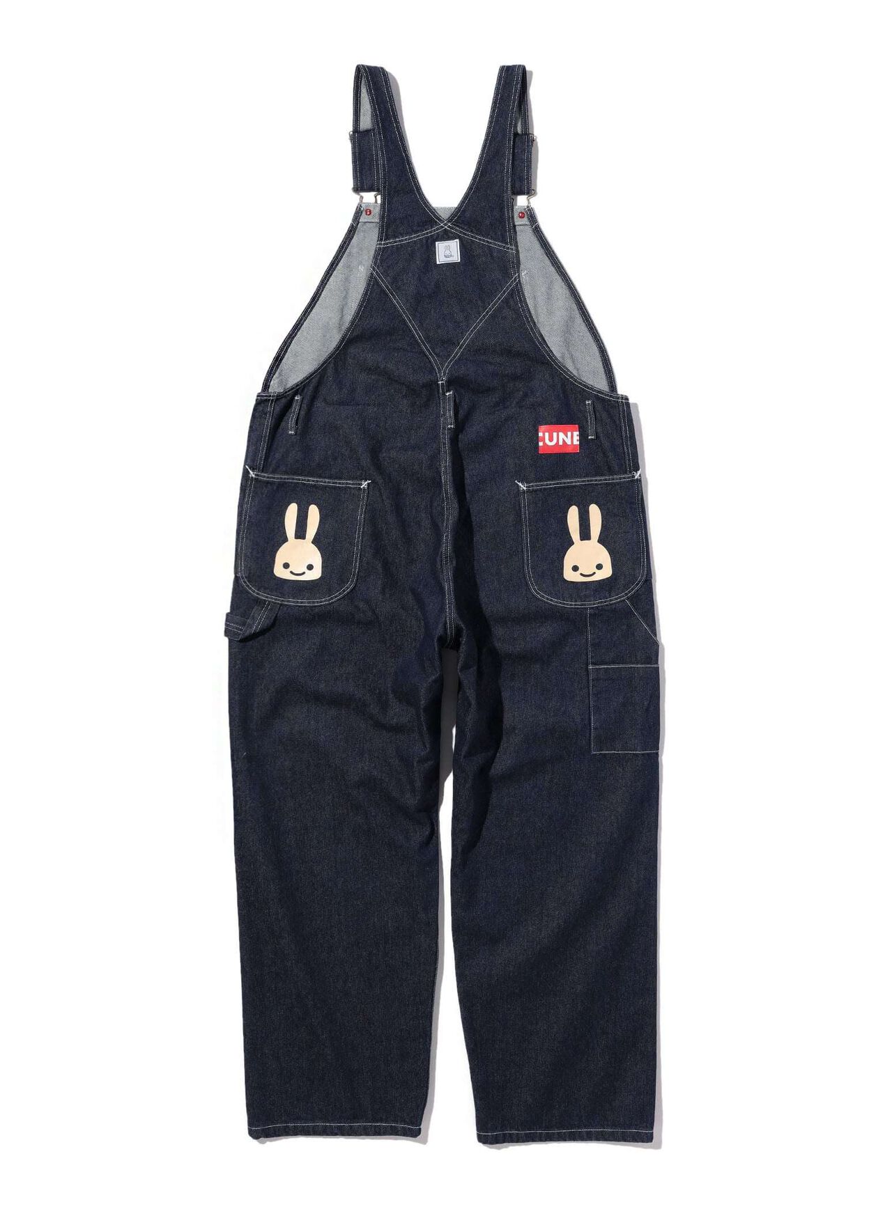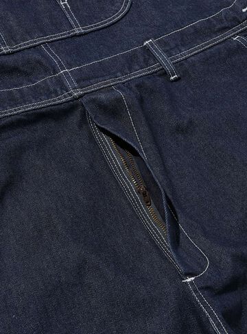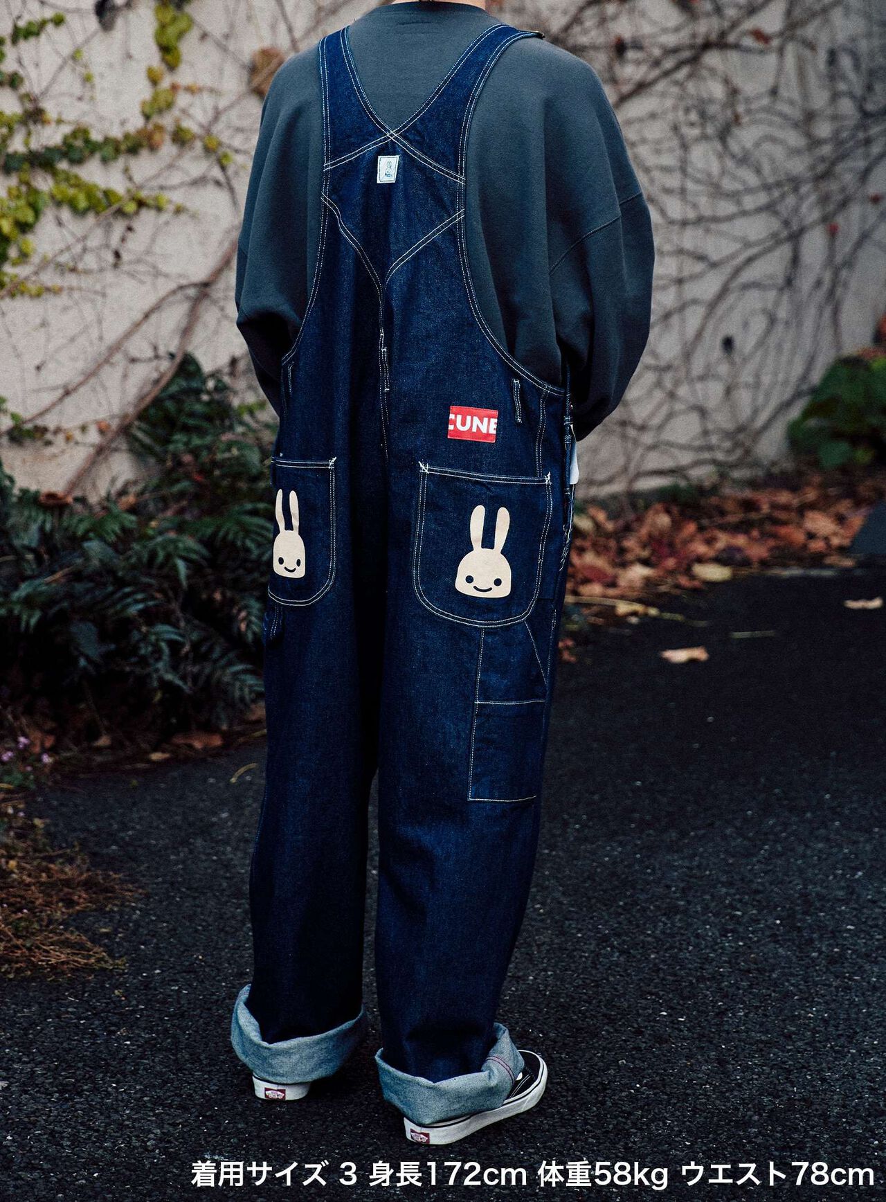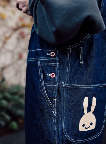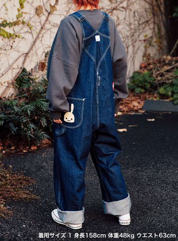 Overalls made of denim fabric. They have a wide silhouette and drop to the knees, and the hems have been lengthened with the assumption that they can be worn rolled up. The belt loops on the front allow you to wear them with the belt hanging down the front. Original printed fabric is used for the lining. Because of the product processing, there are individual differences in the processing feel, and there are puckering and slips in the print.