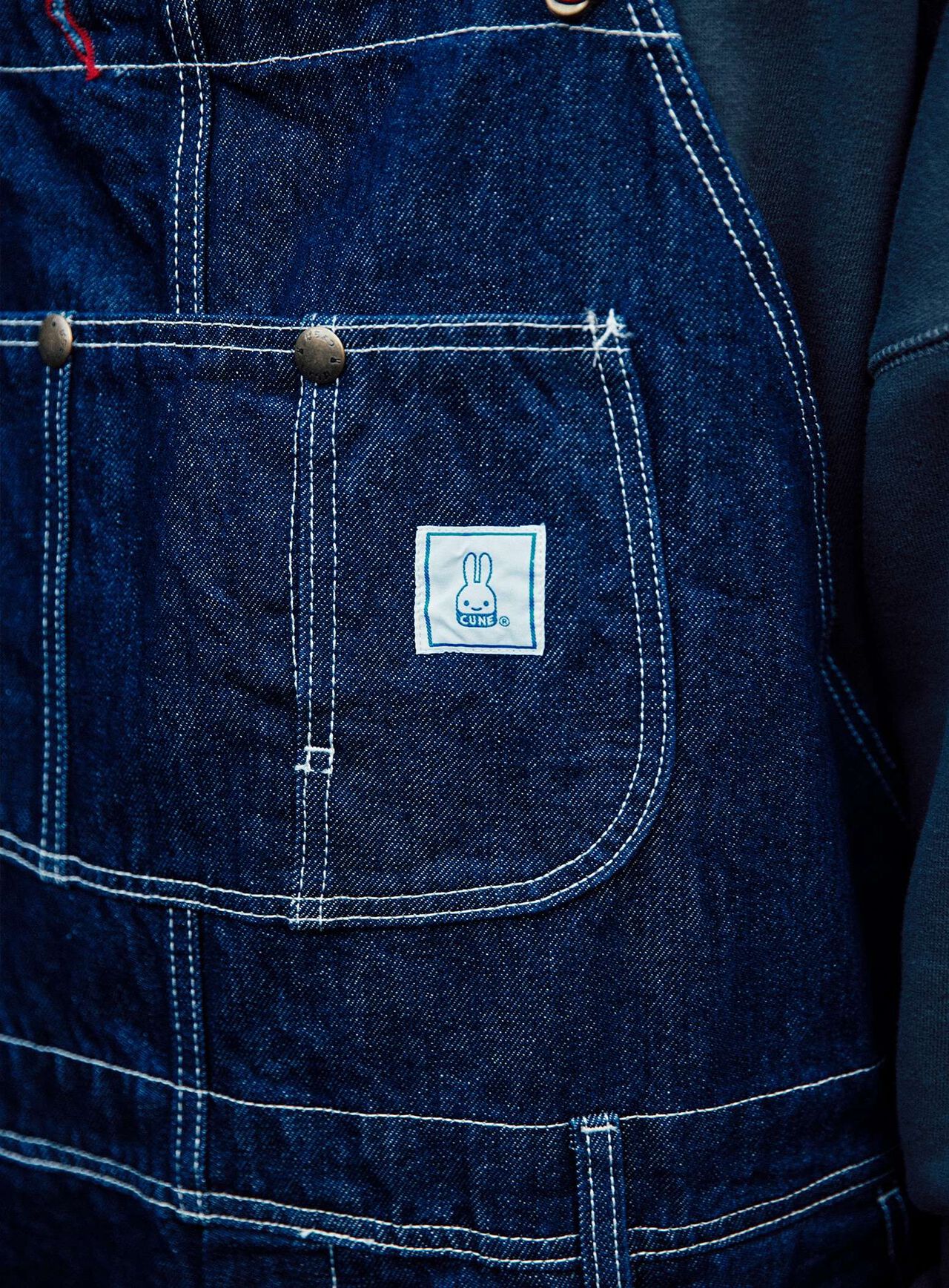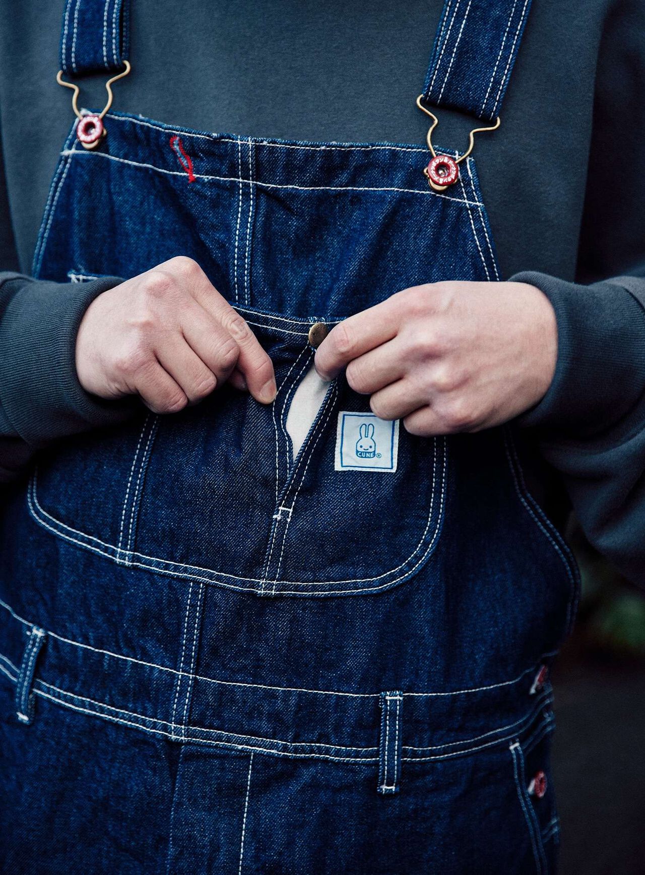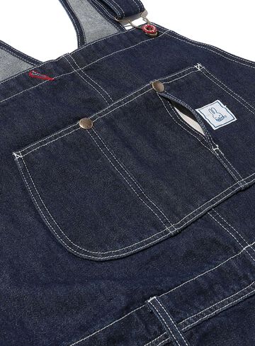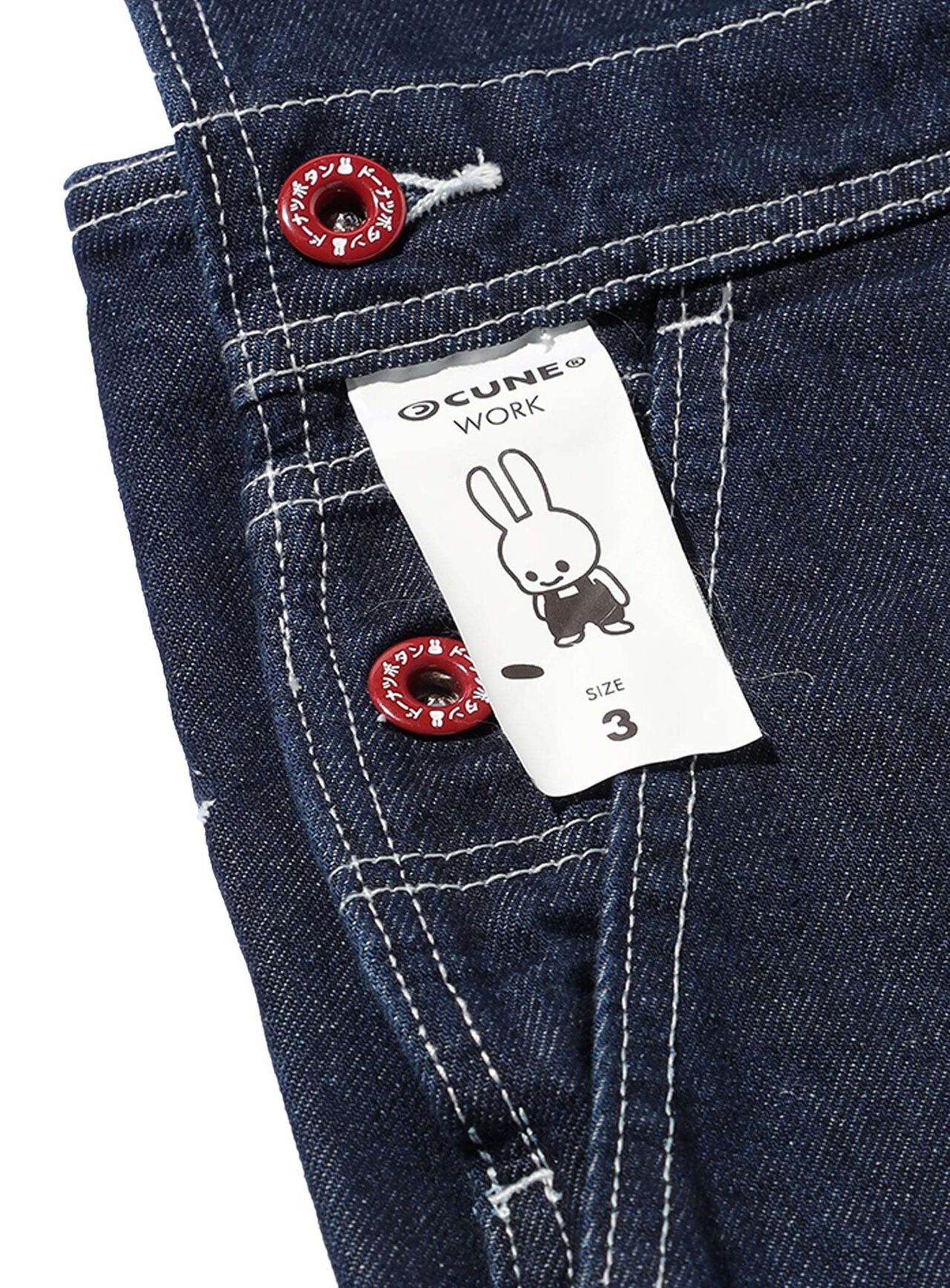 Overalls made of denim fabric. They have a wide silhouette and drop to the knees, and the hems have been lengthened with the assumption that they can be worn rolled up. The belt loops on the front allow you to wear them with the belt hanging down the front. Original printed fabric is used for the lining. Because of the product processing, there are individual differences in the processing feel, and there are puckering and slips in the print.