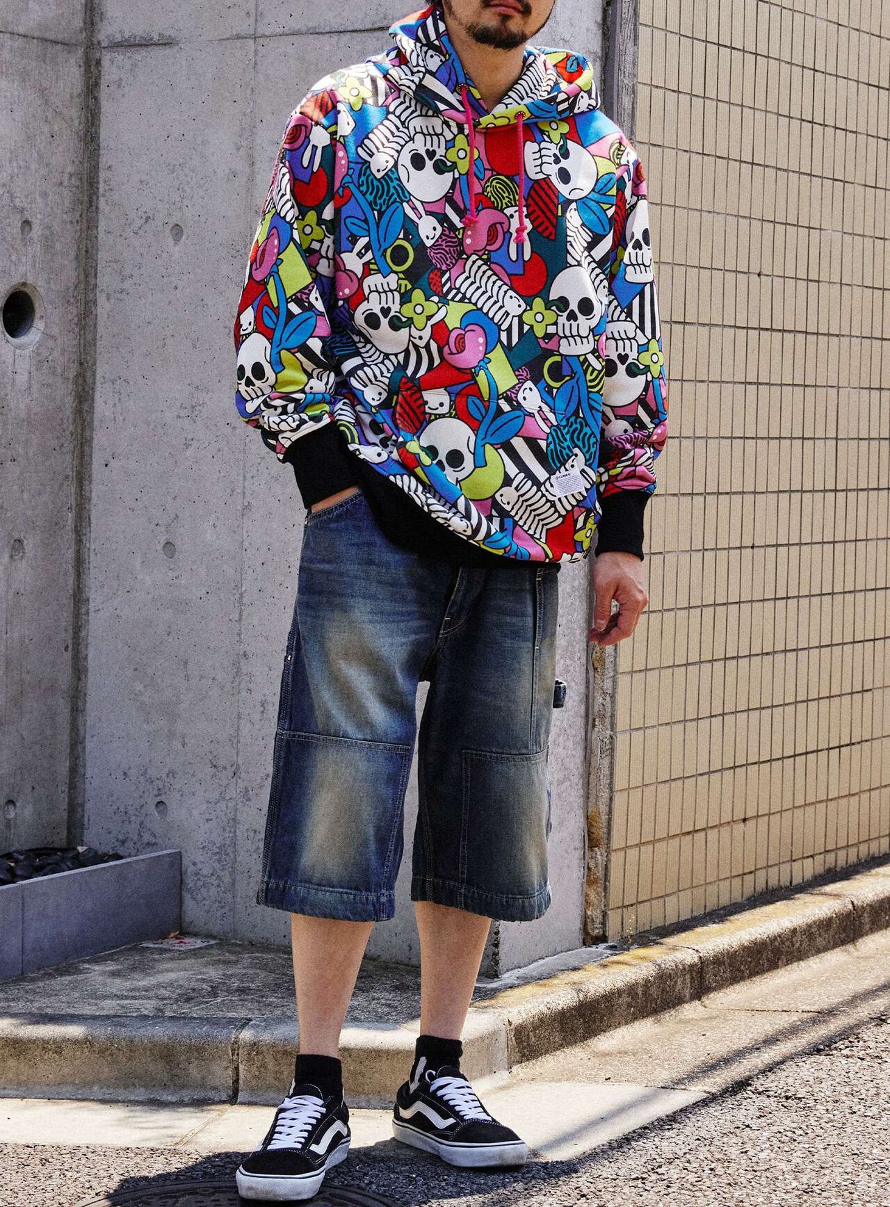 Hoodie made of T/C-lined wool with an original all-over pattern print with good coloring. It is made of a solid material and has a large silhouette. The sleeves have elbow darts that do not seem to make much sense, and the ribs at the cuffs are sewn with a gentle curve. Original pigeonholes are used for the hood string exit. The hood string can be shifted a little to the right side by passing it through the elastic loop at the collar.