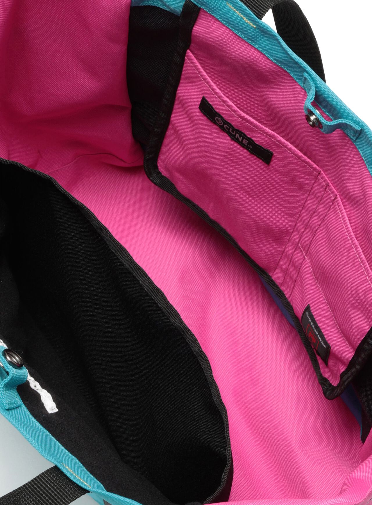 This tote bag has an outside pocket made of mesh. There is one divider on the back side of the main compartment and a pocket on the front side with CSS (CUNE SOUND SYSTEM) The CSS is sewn in and cannot be taken out. The front side zip pull has a string for easy opening and closing. With a mesh pocket on the side.