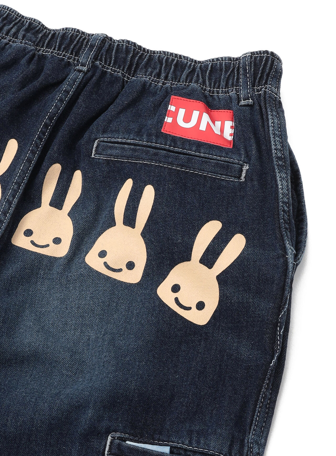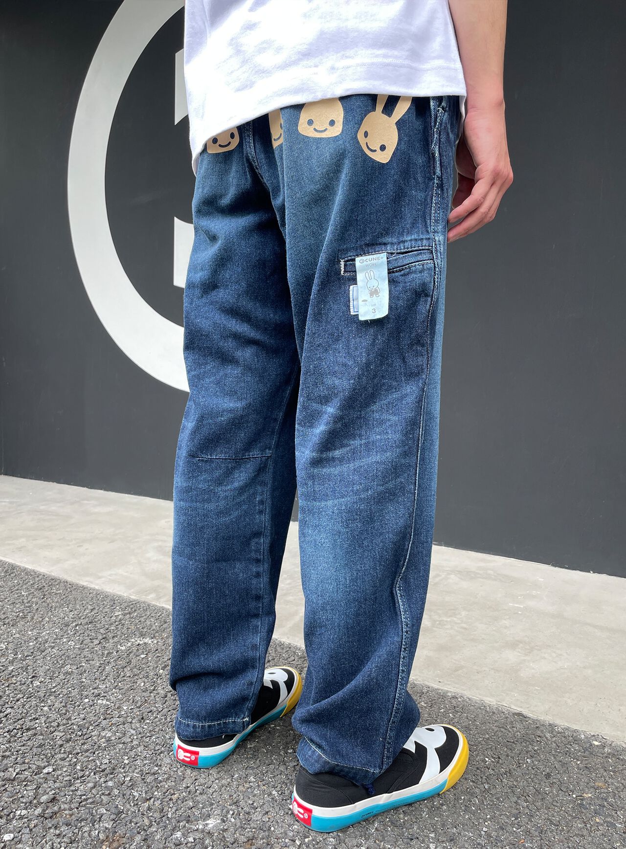 Elastic denim pants made of denim fabric. The waist has elastic and ties so there is no need for a belt. The knees have darts on the front and back sides, making them slightly more three-dimensional. There is a drawcord through the hem, so you can adjust the hem width by tightening it. The original sleeki is used. Because of the product washing process, there is some puckering and slips in the print.