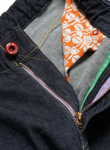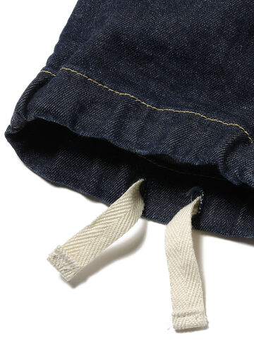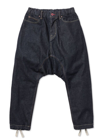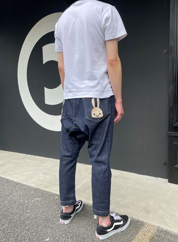 New jeans with an unusually long crotch - Crotch U2, with rabbit-engraved zip pulls, painted neova buttons and rivets, printed lining, and paper patches. The back edge is partially wrapped with tape. The fabric is 13 oz. Japanese stretch denim. There are elastic and ties at the waist. There are ties at the hem to adjust the silhouette. Surprisingly well-made based on jeans . Due to the characteristics of indigo fabric, color fading and color migration may occur due to friction, wetting, and washing. Color transfer to prints may also occur. We cannot accept returns or exchanges due to the characteristics of the fabric, so please purchase with your understanding. The finished dimensions of the product are only a guide, and individual differences may occur due to the state of processing.
