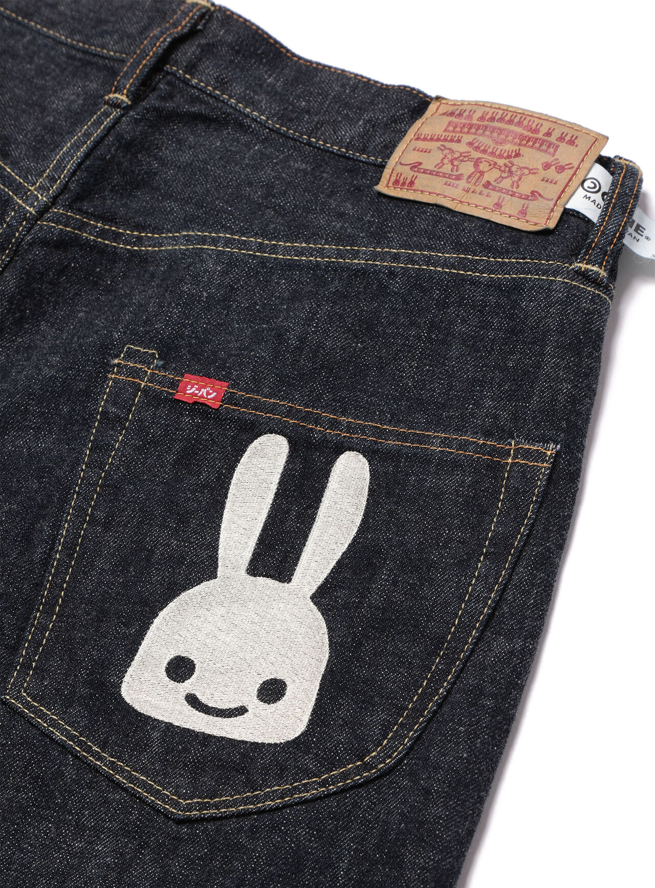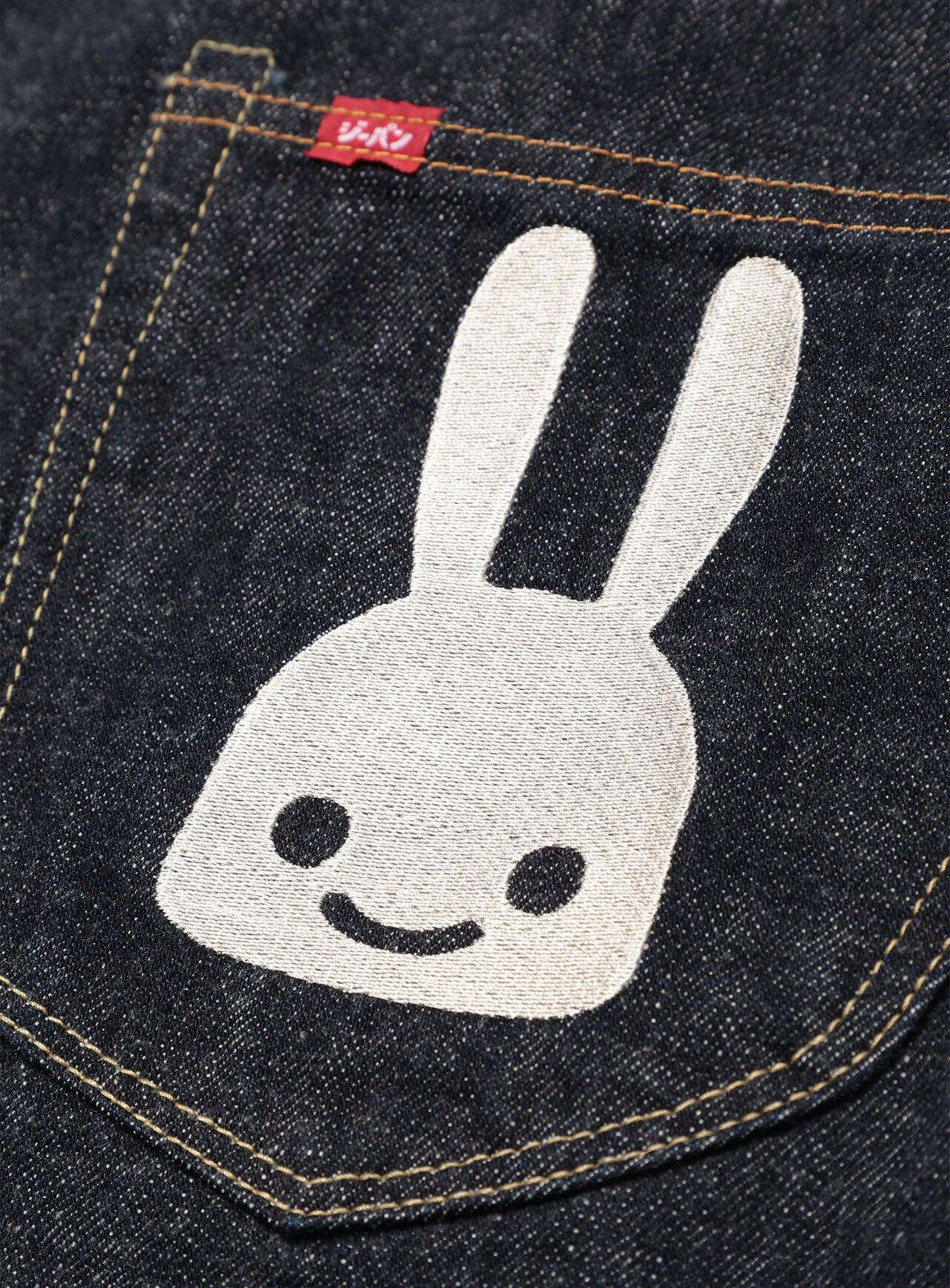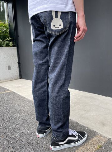 Fully remodeled new jeans - normal. Embroidery. Two rabbits embroidered on the hips. They have rabbit-engraved zip pulls, painted neova buttons and rivets, printed lining, and paper patches. The back edge is partially wrapped with tape. The fabric is 13.5 oz. Japanese denim. It incorporates the sewing method of old jeans, and although it looks ordinary, it is surprisingly well made. *Color fading and color migration may occur due to friction, wetness, and washing due to the characteristics of indigo fabric. Color transfer to prints may also occur. We cannot accept returns or exchanges due to the characteristics of the fabric, so please purchase with your understanding.