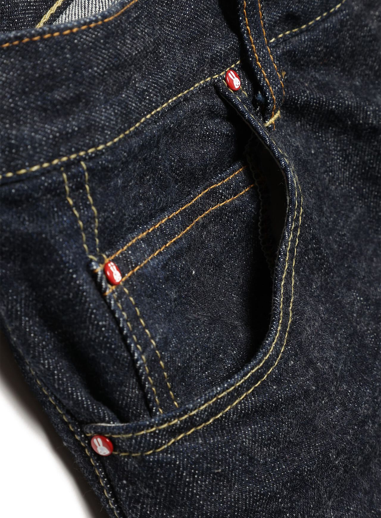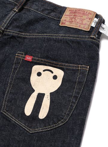 Fully redesigned new jeans - normally reverse U2, with two upside down rabbits printed on the hips. They have rabbit-engraved zip pulls, painted neova buttons and rivets, printed lining, and paper patches. The back edge is partially wrapped with tape. The fabric is 13.5 oz. Japanese denim. It incorporates the sewing method of old jeans, and although it looks ordinary, it is surprisingly well made. *Color fading and color migration may occur due to friction, wetness, and washing due to the characteristics of indigo fabric. Color transfer to prints may also occur. We cannot accept returns or exchanges due to the characteristics of the fabric, so please purchase with your understanding.