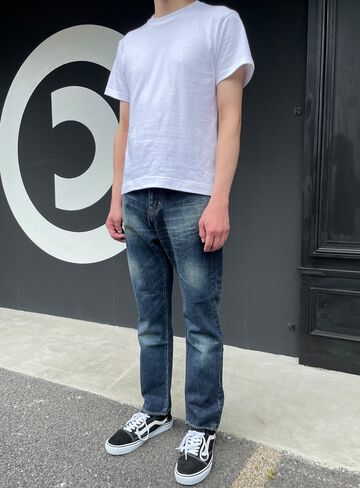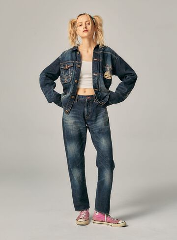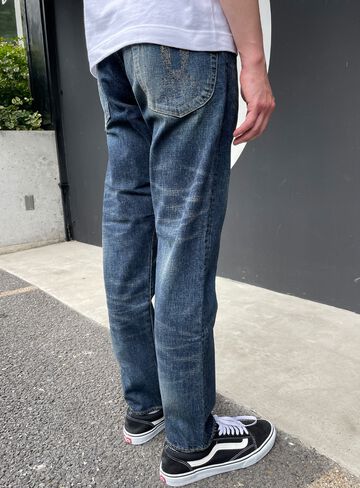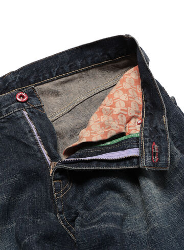 Fully remodeled new jeans - normally U2 with four knees. The processing gives them the appearance of being worn in by someone with four knees. It has rabbit engraved zip pulls, painted neova buttons and rivets, printed lining, and paper patches. The back edge is partially wrapped with tape. The fabric is 13.5 oz. Japanese denim. It incorporates the sewing method of old jeans, and although it looks ordinary, it is surprisingly well made. *Color fading and color migration may occur due to friction, wetting, and washing due to the characteristics of indigo fabric. Color transfer to prints may also occur. We cannot accept returns or exchanges due to the characteristics of the fabric, so please purchase with your understanding.